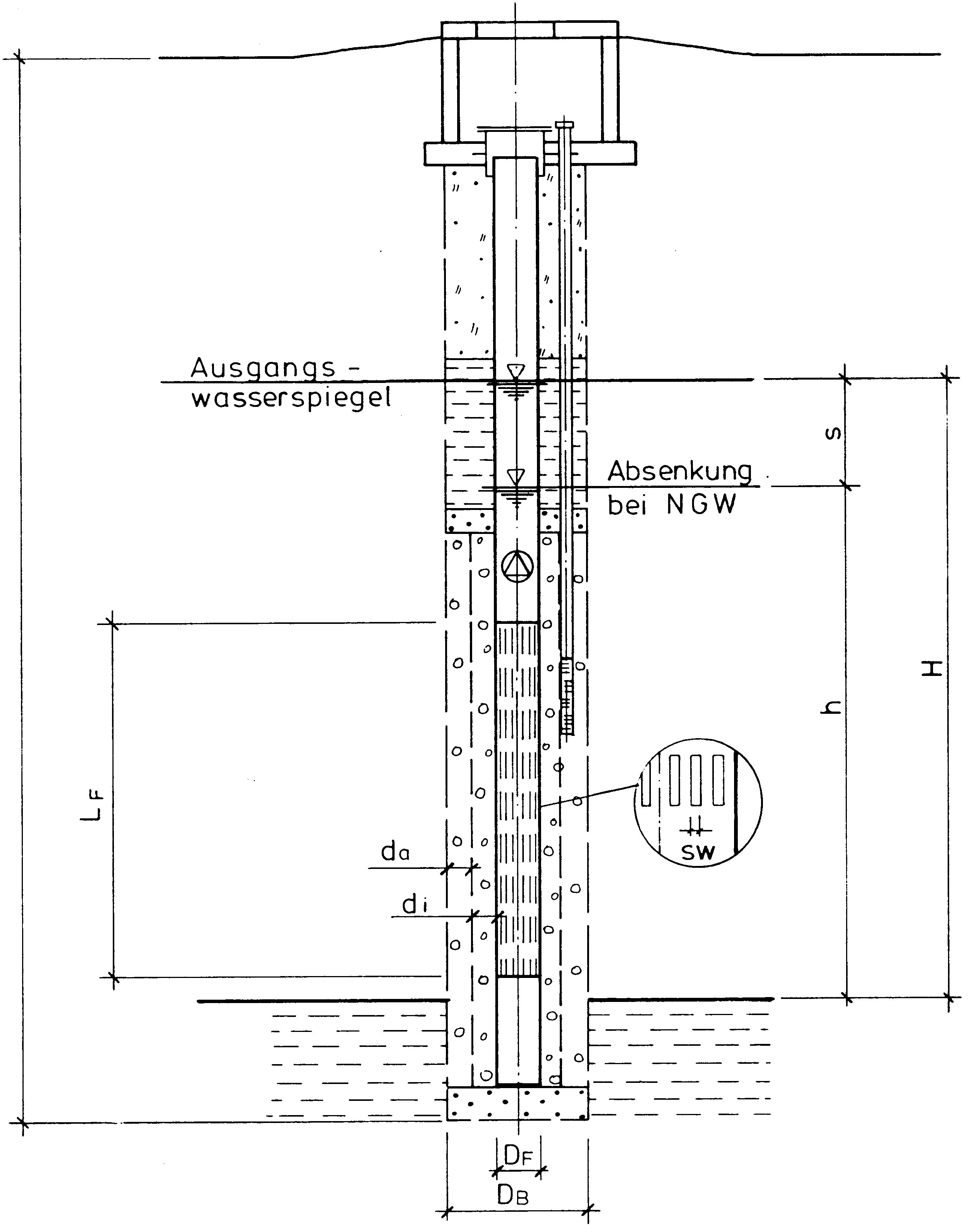 | Maximale Filterlängen, LF, berücksichtigen Sie eine weitere Absenkung bei niedrigen Wasserständen (NGW) um 2 m. | |