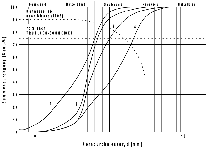 Maßgebend für den Durchmesser der Filterkieskörnung ist der Kennkorndurchmesser dk des Aquifers. Der Kennkorndurchmesser wird am Schnittpunkt von Sieblinie und Kennkornlinie (Bieske et al. 1998) oder bei 75 % Summendurchgang (Truelsen-Schneider) abgelesen (Abb. 2). Beispielsweise für Sieblinie 4 ist dk = 1,9 mm (anhand der Kennkornlinie) oder dk = 2,05 mm (anhand des 75 % Summendurchgangs).