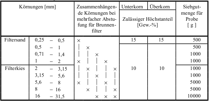 Tab. 1: Filterkieskörnungen nach DIN 4924.