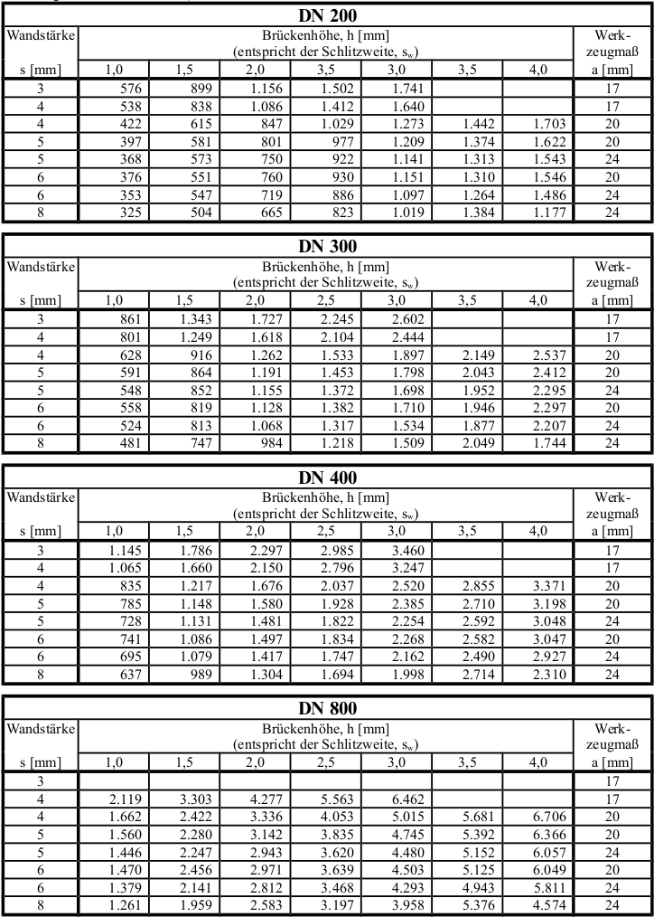 1.163 cm2/m : DN 400 1.481 cm2/m : sw = 2,0 mm, Wandstärke 5 mm