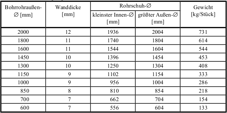 Tab. 3: Auswahl von geeigneten Bohrdurchmessern für verrohrte Drehbohrverfahren.