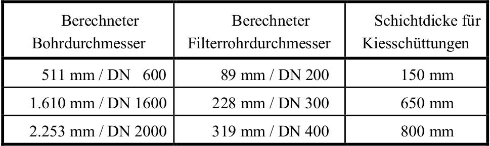In Tab. 4 sind die berechneten Bohr- und Filterdurchmesser gegenübergestellt. Die Schichtdicke für die Kiesschüttung ergibt sich aus der Differenz zwischen Bohr- und Filterrohrdurchmesser: (dB – dF) / 2