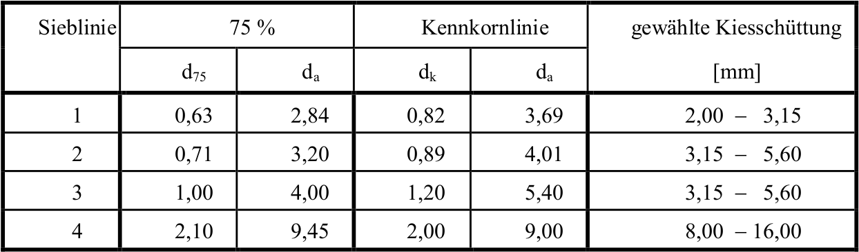 Der Kennkorndurchmesser dk für die Sieblinien 1-4 wurden sowohl beim 75 % Summendurchgang abgelesen als auch beim Schnittpunkt mit der Kennkornlinie. Die gewählten Kiesschüttungen sind in Tab. 6 zusammengefasst.