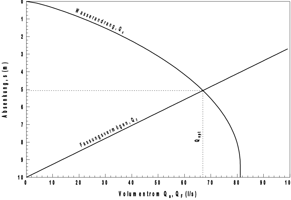 Die Parameter QF und Qa werden in Abhängigkeit der Absenkung ermittelt, wobei mit zunehmender Absenkung QF abnimmt (ungespannt), bzw. konstant bleibt (gespannt) und Qa zunimmt. Die günstigste Brunnenleistung Qopt ist gegeben, wenn das Fassungvermögen gleich dem Wasserandrang ist: