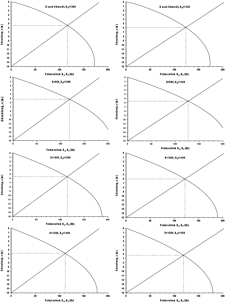 Die gegenläufigen Kurven des Wasserandranges und des Fassungsvermögens wurden für die Bohrenddurchmesser DB1 und DB2 in der Abb. 2: Ermittlung von Qopt durch Schnittpunktbestimmung von Qa(s) und QF(s). Variation des Bohrdurchmessers: links,rechts - Variation der Reichweiten: oben bis unten.) aufgetragen. Der jeweilige günstigste Betriebspunkt ist in Tab. 1 zusammengefasst.