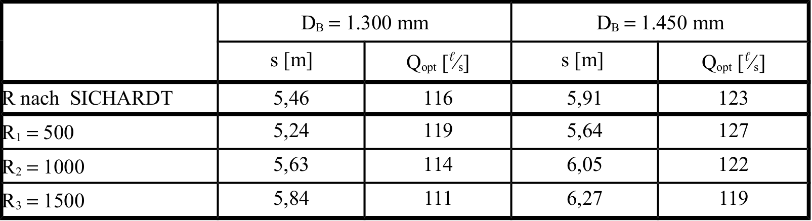 Berechnung der Reichweiten nach Sichardt: Durch die Vergrößerung des Bohrdurchmessers von 1300 mm auf 1450 mm wird eine Steigerung von Qopt um 7 ℓ/s bei einer gleichzeitigen Vergrößerung der Absenkung um ca. 0,45 m erreicht. Variation der Reichweiten: Der Einfluss der vorgegebenen Reichweiten ist sehr gering. Die berechneten optimalen Entnahmemengen variieren um rund 10 %.