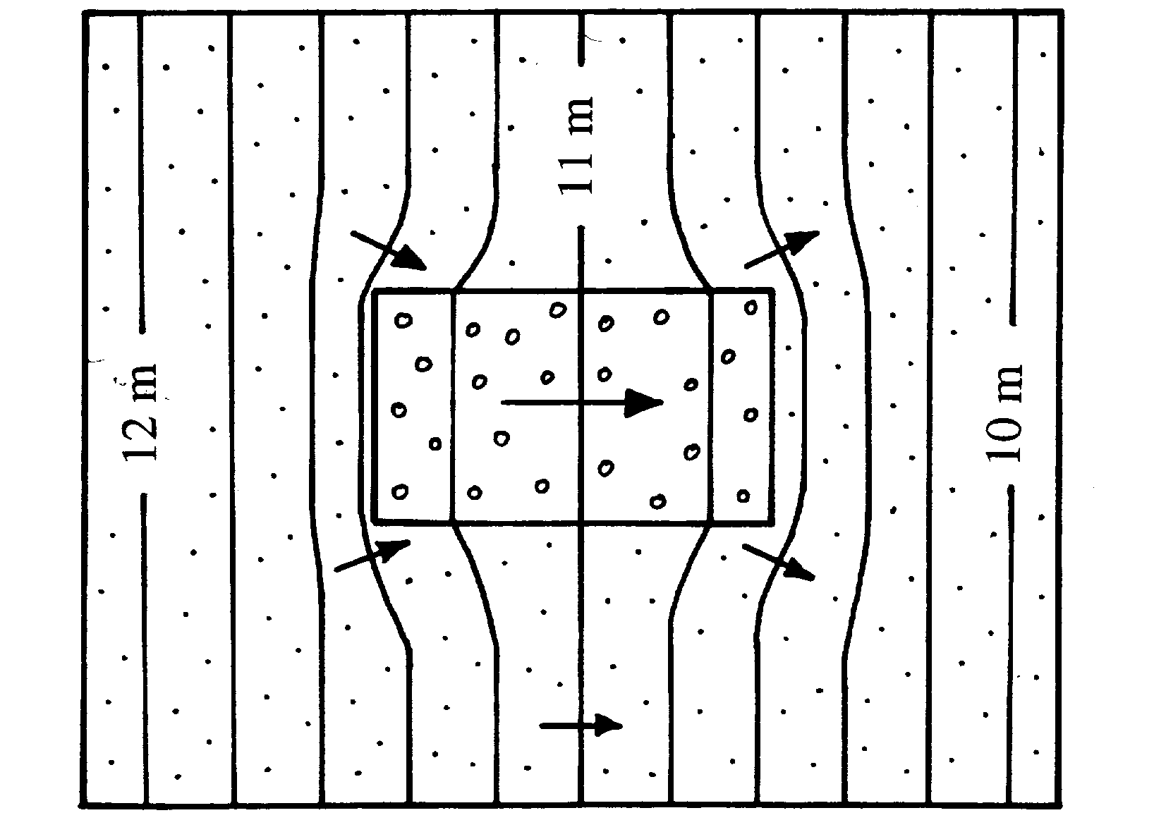 Die Strömung verläuft parallel zur Schichtung. Entlang des Fließweges ist die Durchlässigkeit und somit auch der Gradient konstant. Die Fließgeschwindigkeiten variieren entsprechend der Durchlässigkeit. Beispielsweise bei einer Erhöhung der Durchlässigkeit um den Faktor 10 erhöht sich die Geschwindigkeit um den Faktor 10 (Abb. 5 und Abb. 6).