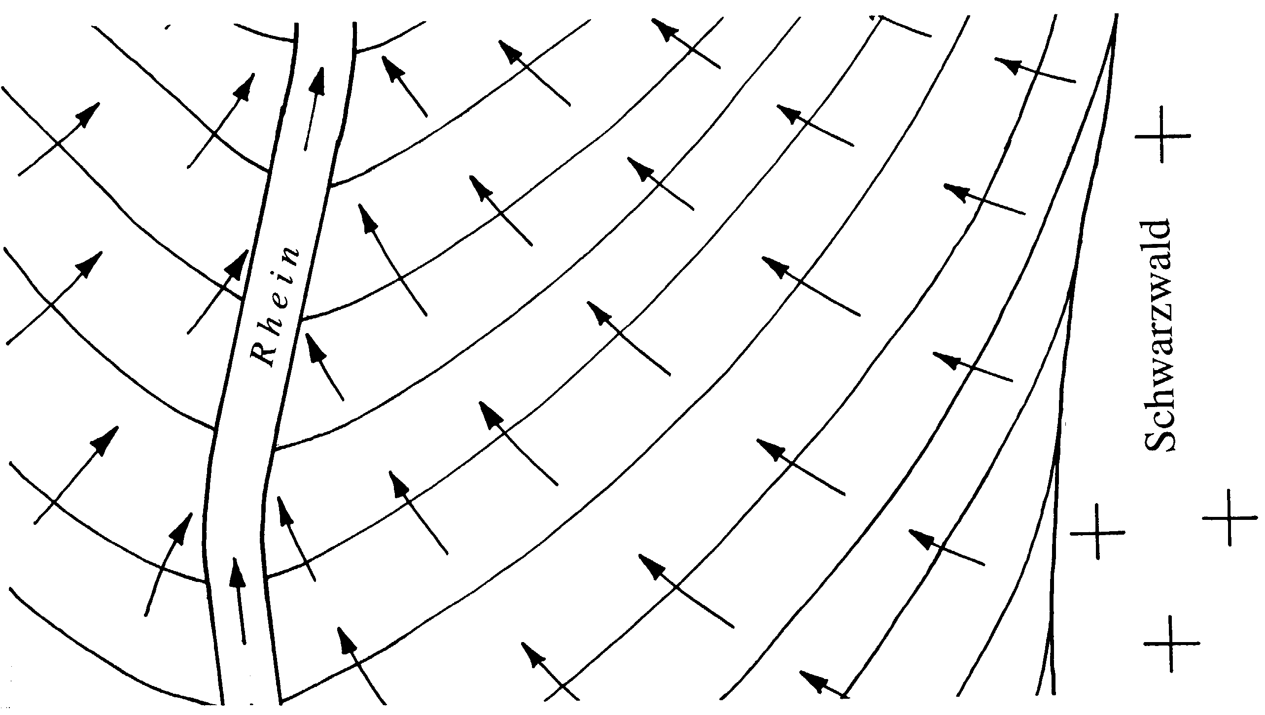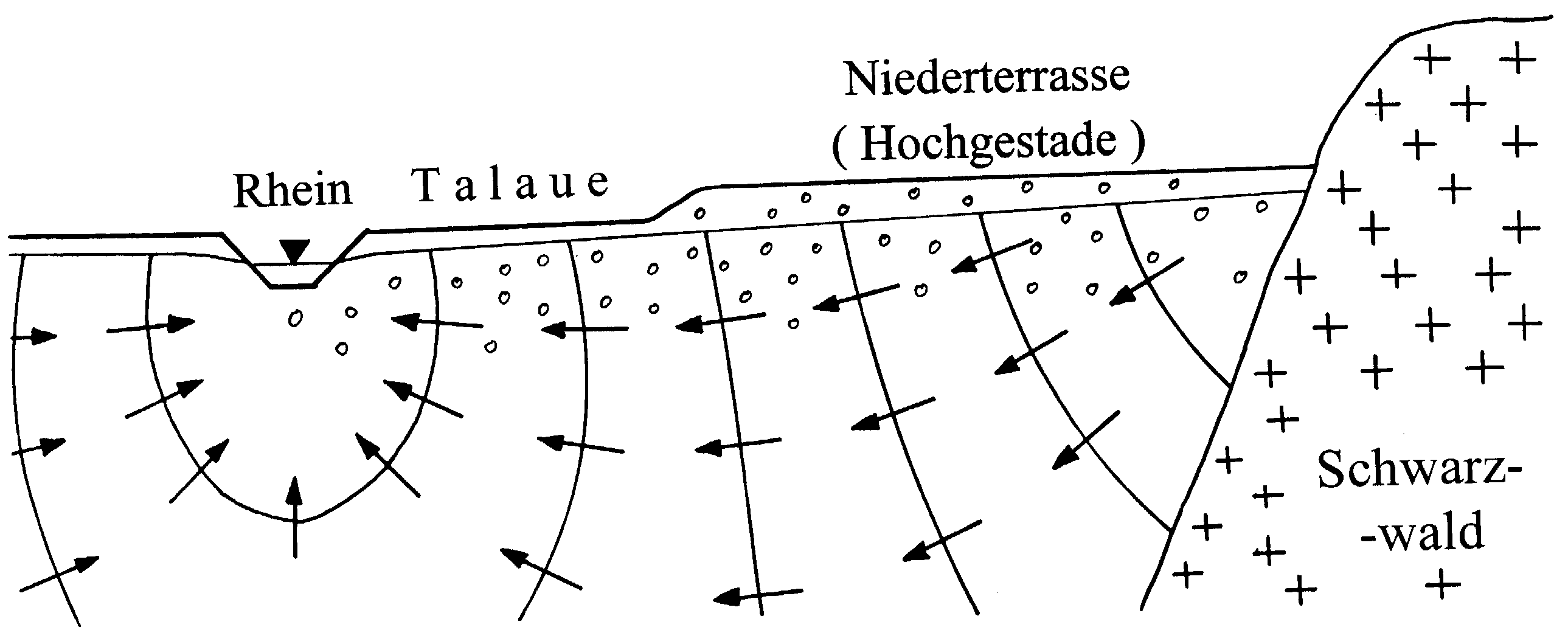 Es werden hier vereinfachend homogene Durchlässigkeiten angenommen. Im Gegensatz zu den bisherigen Szenarien wird hier die Grundwasserneubildung berücksichtigt. Der unterirdische Zustrom aus dem Schwarzwald ist sehr gering, so dass dort der Zustrom der Neubildung dominiert und die Strömung schräg nach unten gerichtet ist. Durch die Exfiltration des Grundwassers kommt es im Bereich des Rheins zu einer schräg nach oben gerichteten Grundwasserströmung (Abb. 11 und Abb. 12)