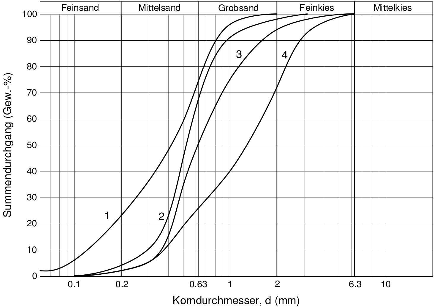 Der Zusammenhang zwischen Korngröße und Durchlässigkeit wird empirisch quantifiziert. Maßgebend für die Durchlässigkeit ist die Verteilung der Korngröße. Parameter, die die Korngrößenverteilung charaktersisieren, werden anhand einer Sieblinie ermittelt. Die Sieblinie stellt die Gewichtsprozente der Körner mit bestimmtem Durchmesser dar, die in Form einer Summenkurve aufgetragen werden (Abb. 1).