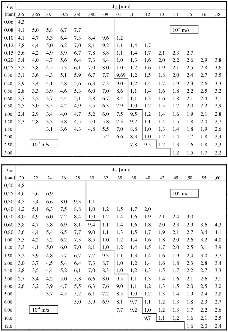 | Lithologischer Aufbau | U = d60/d10 | Gültigkeitsbereich für d10 [mm] | Koeffizient, C |