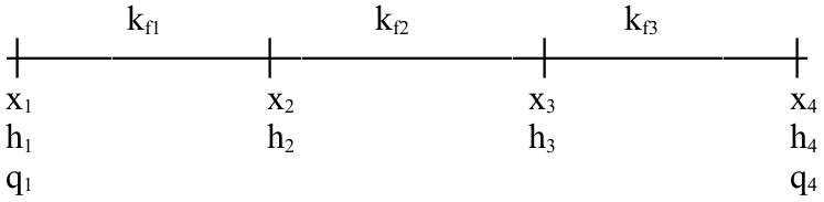 In Abb. 2 ist die Diskretisierung eines eindimensionalen Aquifers dargestellt, der in drei Abschnitte unterteilt wird. Für jeden Abschnitt wird ein spezieller kf-Wert definiert. Die Grundwasserhöhen hi werden für vier Stützstellen xi berechnet.