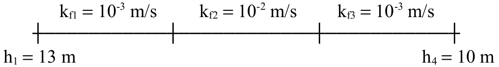 Die Grundwasserhöhen an den Stellen x1 und x4 seien bekannt. Für die Stellen x2 und x3 werden die kf-Werte und Grundwasserhöhen in die Laplace-Gleichung eingesetzt (Tab. 1).