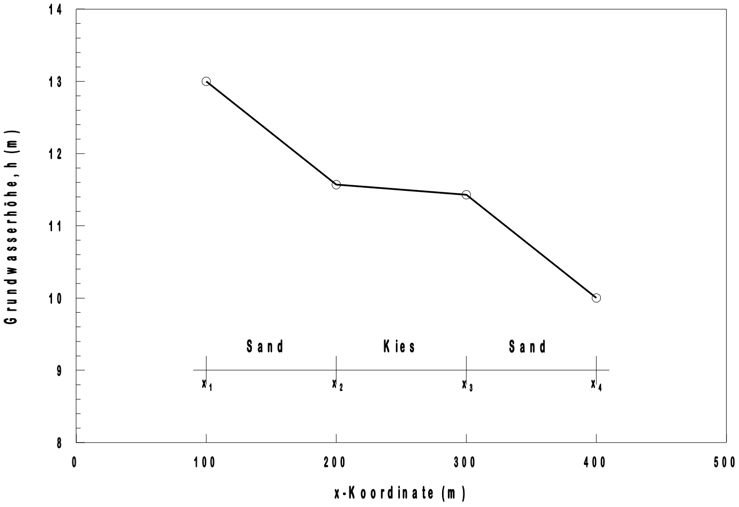 Beispielsweise für bekannte Grundwasserhöhen von h1 = 13 m und h4 = 10 m an den Modellrändern sind die übrigen Grundwasserhöhen h2 und h3