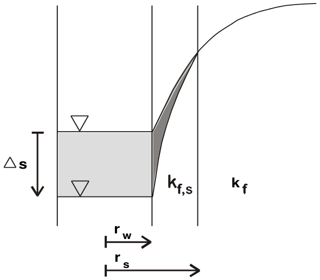 Die Brunneneintrittsverluste werden durch den Skinfaktor SF quantifiziert. Sobald der Brunnenspeichereffekt vernachlässigbar ist, gilt für den Skinfaktor und den zusätzlichen Absenkungsbetrag Δs folgender Zusammenhang (Abb. 1):