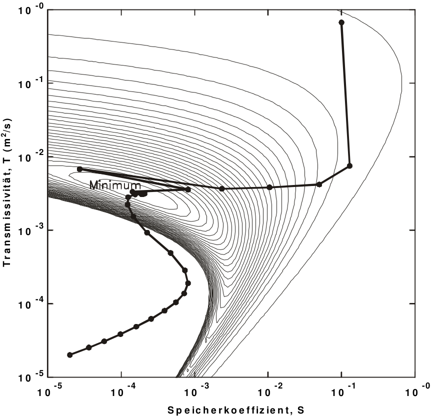Die Bestimmung der Parameter erfolgt durch eine Inversionsrechnung. Das Prinzip der linearen Inversion wurde bereits im Kapitel „Stationär“ anhand der Cooper-Jacob-Funktion erläutert und für wenige Messwerte durchgeführt. Hier wird entsprechend der nichtlinearen Modellfunkton nach Theis eine nichtlineare Inversionsrechnung angewendet.