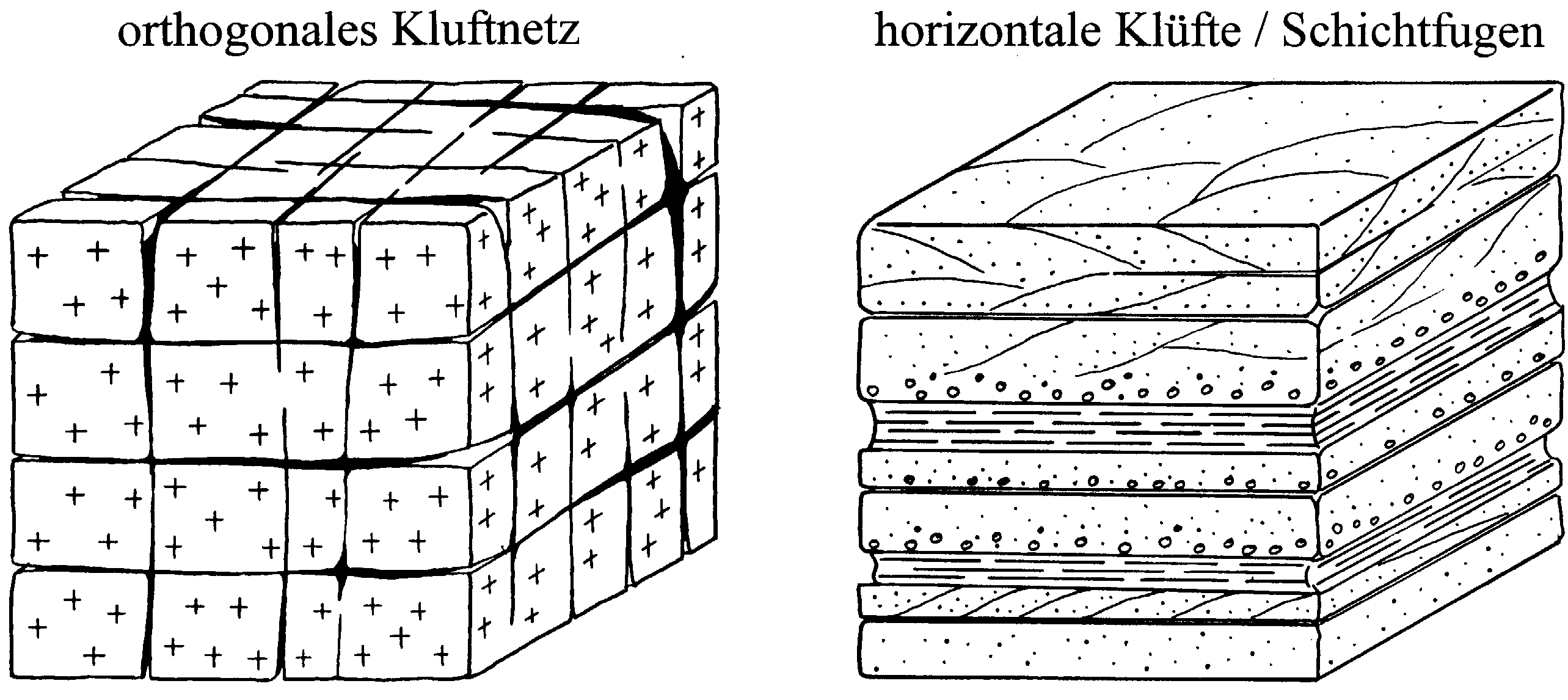 Zwei Kluftsysteme werden unterschieden (Abb. 1): Ein orthogonales Kluftnetz (z.B. in Granite) und horizontale Klüfte (z.B. Schichtfugen).