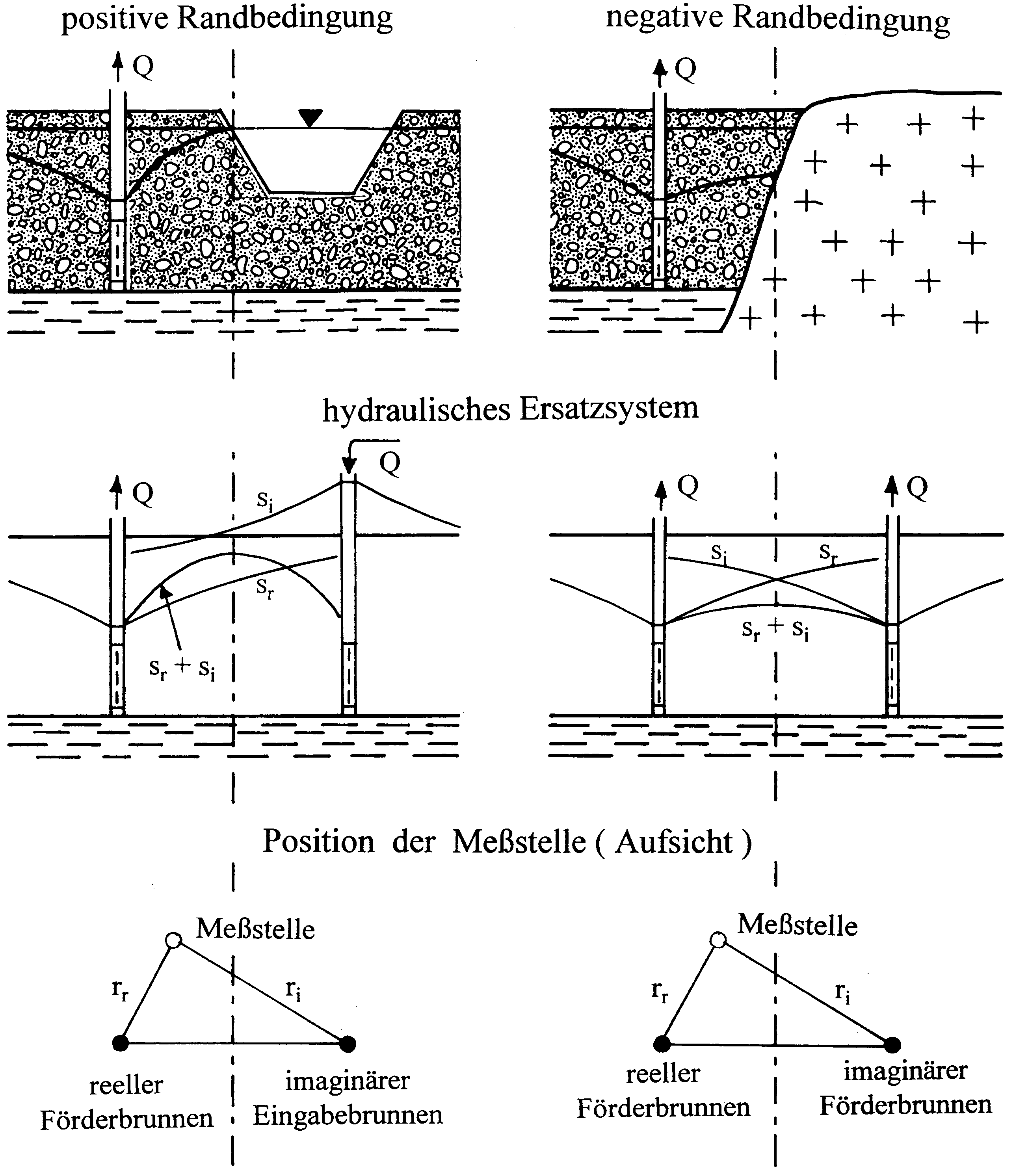 Der Einfluss einer positiven oder negativen Randbedingung wird mit einem hydraulischen Ersatzsystem simuliert. Dazu wird ein weiterer imaginärer Brunnen verwendet, der in der doppelten Entfernung 2r liegt. Das Oberflächengewässer wird durch einen imaginären Eingabebrunnen und eine laterale Begrenzung durch einen imaginären Förderbrunnen simuliert. Die Entnahme- oder Eingaberaten sind betragsmäßig gleich der Entnahmerate aus dem realen Brunnen (Abb. 1, Mitte).