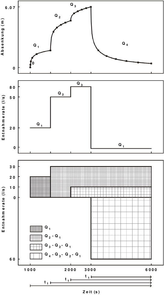 In Abb. 1 wird dieses Prinzip erläutert. In einem gespannten Aquifer wurde ein dreistufiger Pumpversuch mit folgenden Entnahmemengen durchgeführt (mittlere Graphik):