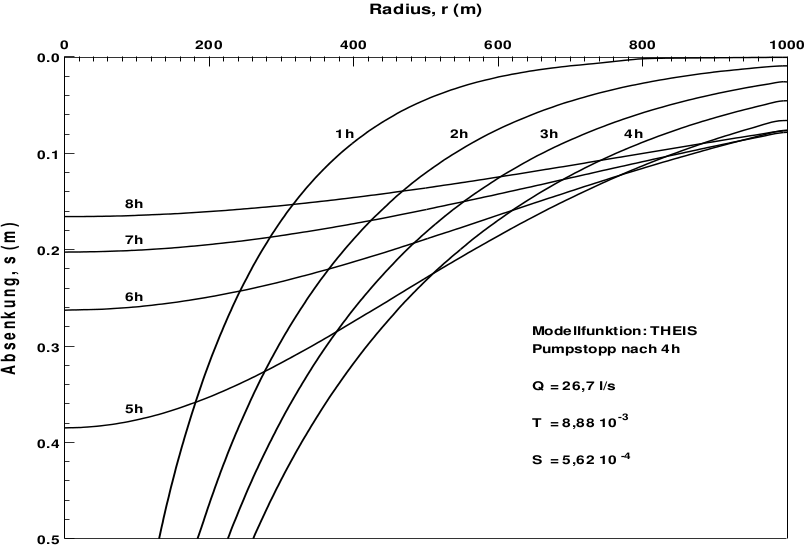 Beim Wiederanstieg handelt es sich nicht um einen gewöhnlichen Pumpversuch mit umgekehrten Vorzeichen, sondern um eine Überlagerung von mindestens zwei imaginären Pumpversuchen. Deutlich wird die Überlagerung in Abb. 2, wo die Absenkungen für jede volle Stunde seit Pumpbeginn nach Theis berechnet und als s→r aufgetragen wurde. Nach dem Abstellen der Pumpe senkt sich in größerer Entfernung weiterhin der Absenkungstrichter, während in Brunnennähe das Grundwasser wieder ansteigt.