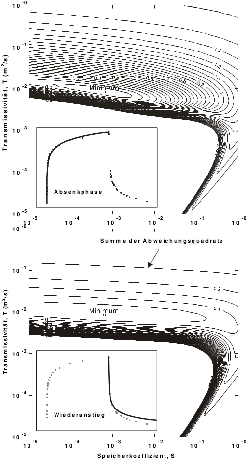 Die Sensitivität der Parameter wird anhand der Abb. 3 erläutert. Dazu wurden die Varianzen (Summe der Abweichungsquadrate) anhand der Modellfunktion nach Theis berechnet und in Form von Isolinien in Abhängigkeit von S und T aufgetragen. Das Minimum gibt diejenige Parameterkombination wieder, für die das Modell am besten angepasst ist.
