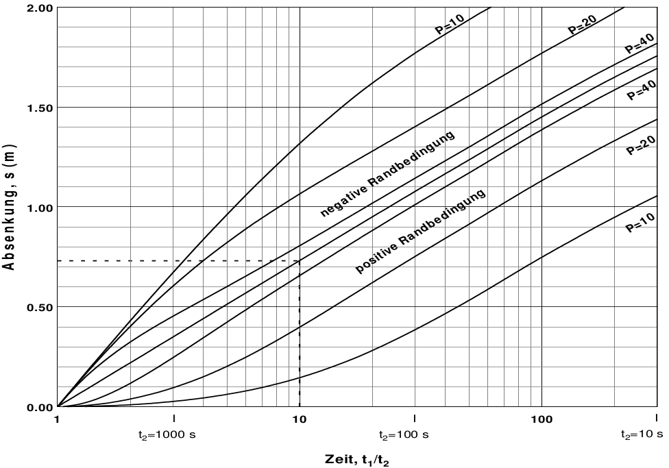 Häufig wird der Pumpversuch durch Zuflüsse überlagert. Diese bewirken, dass die Kurve nach rechts verschoben wird, wobei die Linearität nur noch näherungsweise gewährleistet ist. Hierzu wurde der theoretische Wiederanstieg auch nach Stallman mit aufgetragen. Eine Regressionsgerade würde die x-Achse für t1/t2 ≠ 1 schneiden. In diesem Fall müssen die Randbedingungen „eleminiert“ werden, indem die Regressionsgerade parallel zur x-Achse verschoben wird, so dass sie durch t1/t2 = 1 für s = 0 geht.