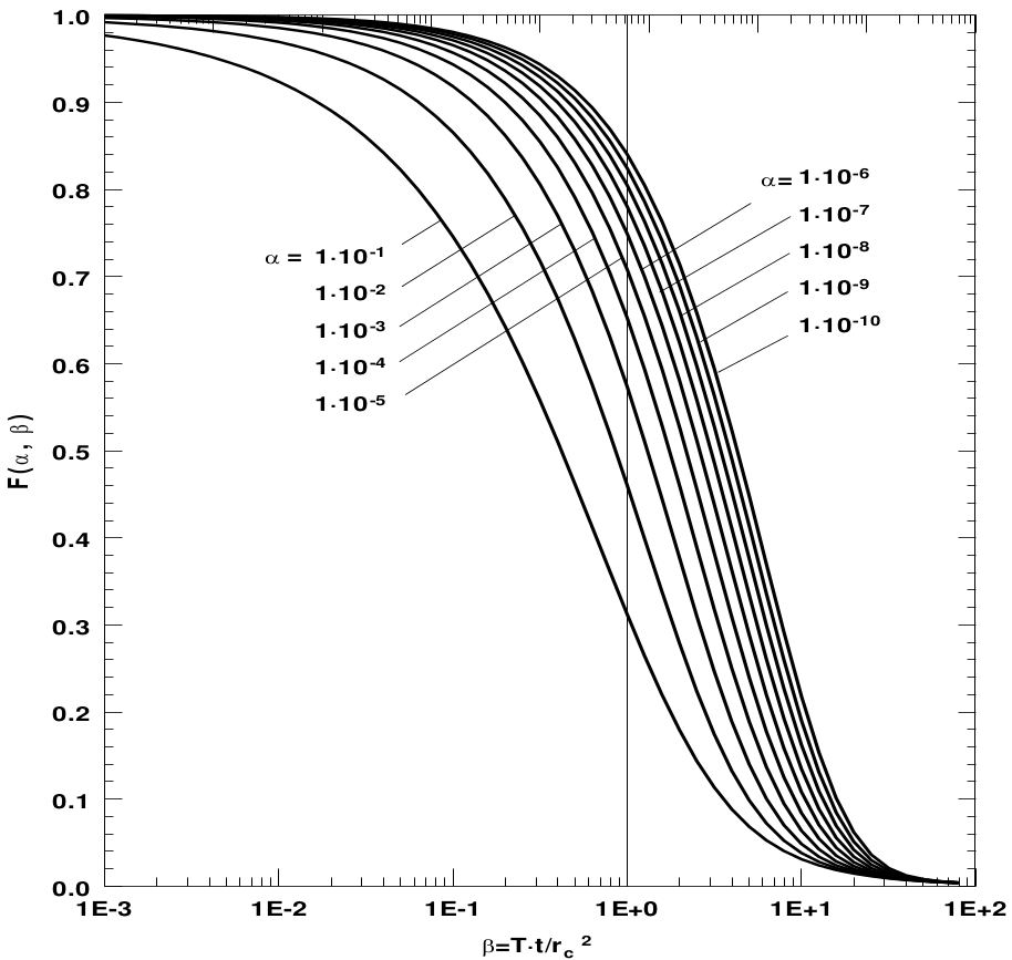 Die Absenkungswerte werden zunächst normiert, das heißt, die Absenkungen werden durch den maximalen Wert zu Beginn des Slug-Test dividiert. Die normierten Messwerte werden halblogarithmisch im gleichen Maßstab wie die Typkurven Abb. 1 graphisch aufgetragen und mit den Typkurven zur Deckung gebracht. Für β = 1 wird t abgelesen, α kann direkt abgelesen werden. t und α werden in die folgenden Gleichungen eingesetzt, die nach den Parametern T und S aufgelöst werden: